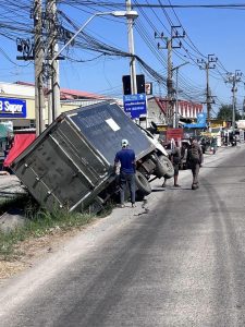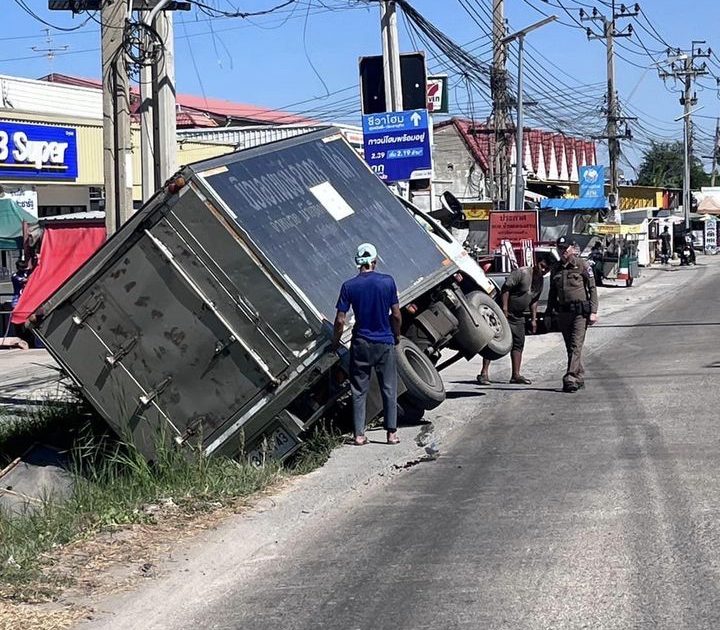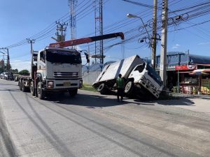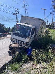เกิดเหตุรถบรรทุก 6 ล้อ ตกข้างทางบริเวณหน้าวัดคลองสวน ร.ต.อ.สุธีร์ สลับลึก รอง สวป.ฯ (ร้อยเวร 20)และ ส.ต.ต.ประพัฒน์ ถิรกมลพันธ์ ผบ.หมู่(ป.)ฯ (พลขับ20)