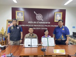 ภายใต้การอำนวยการของ พ.ต.อ.ชาญชัย ฤทธิฦาชัย ผกก.สภ.บ้านคลองสวน มอบหมายให้ พ.ต.ท.นันทพล ดำนิล รอง ผกก.ป.สภ.บ้านคลองสวน ร่วมกับ โรงเรียนบ้านขุนสมุทรไทย นำโดย นางสาวฐิรชญา มหาสุข ผู้อำนวยการโรงเรียนและคณะ ร่วมลงนามบันทึกข้อตกลงความร่วมมือ “โครงการสถานศึกษาสีขาว ปลอดยาเสพติดและอบายมุข” ณ ห้องประชุมชั้น 3 สภ.บ้านคลองสวน