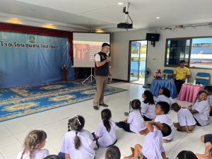 มอบหมายให้เจ้าหน้าที่วิทยากร สภ.บ้านคลองสวน อบรมให้ความรู้เกี่ยวกับยาเสพติดและบุหรี่ไฟฟ้า แก่นักเรียนประถมศึกษาปีที่ 1 – 6 โรงเรียนชุมชนวัดสาขลา